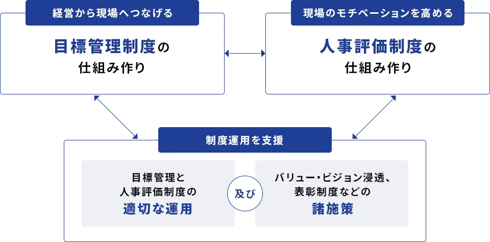 経営理念や価値観浸透、マネジメント力の向上、人材育成、モチベーションアップ、現場力を高めるために、一貫した制度構築と正しい運用が必要です。