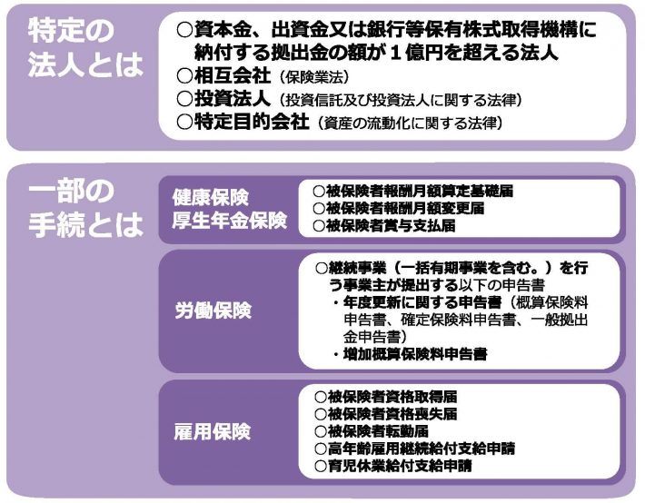 行政手続きに要する事業者の作業時間を削減するため、電子申請の利用促進を図る一環として、一定の規模の「特定の法人」は、社会保険・労働保険に関する一部の手続きを行う場合には、必ず電子申請で行うこととしています。義務化される法人と手続きは次のとおりです。