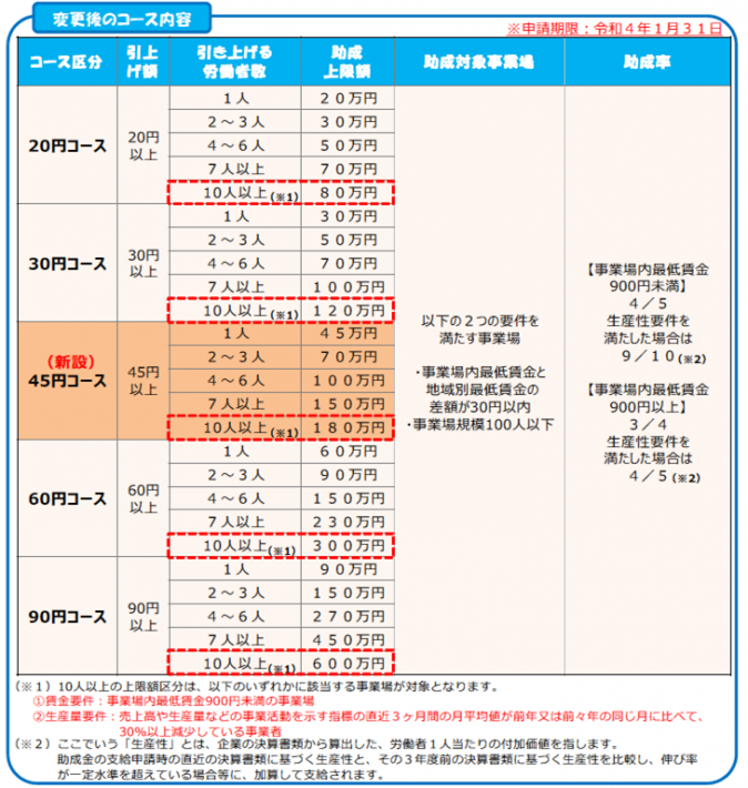 助成金の金額は、事業所内の最低額の引き上げ額で異なり、20円以上から90円以上の範囲内の区分と、その引き上げた従業員の数に応じて決まります。以下の表を参考にしてください。なお8月から特例的な要件緩和と給付拡充(表の赤点線囲み箇所の支給額拡充や、支出費用にPC・スマホが対象になるなど)が行われています。