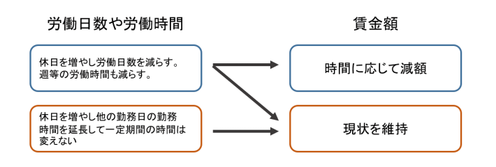 そこで、週休3日勤務を考えてみると、具体的な取り組みを検討するときの大きな着目点は、2つあると思います。