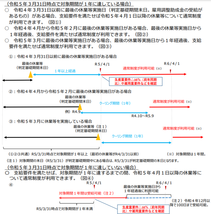 令和5年4月1日以降は、支給要件を満たせば通常の制度を利用することができます。ただし、コロナ特例を利用していた事業所が通常制度を申請する場合、最後の休業等実施日から1年間を経過している必要があります。これについては、事例ごとに取扱いが公表されています。