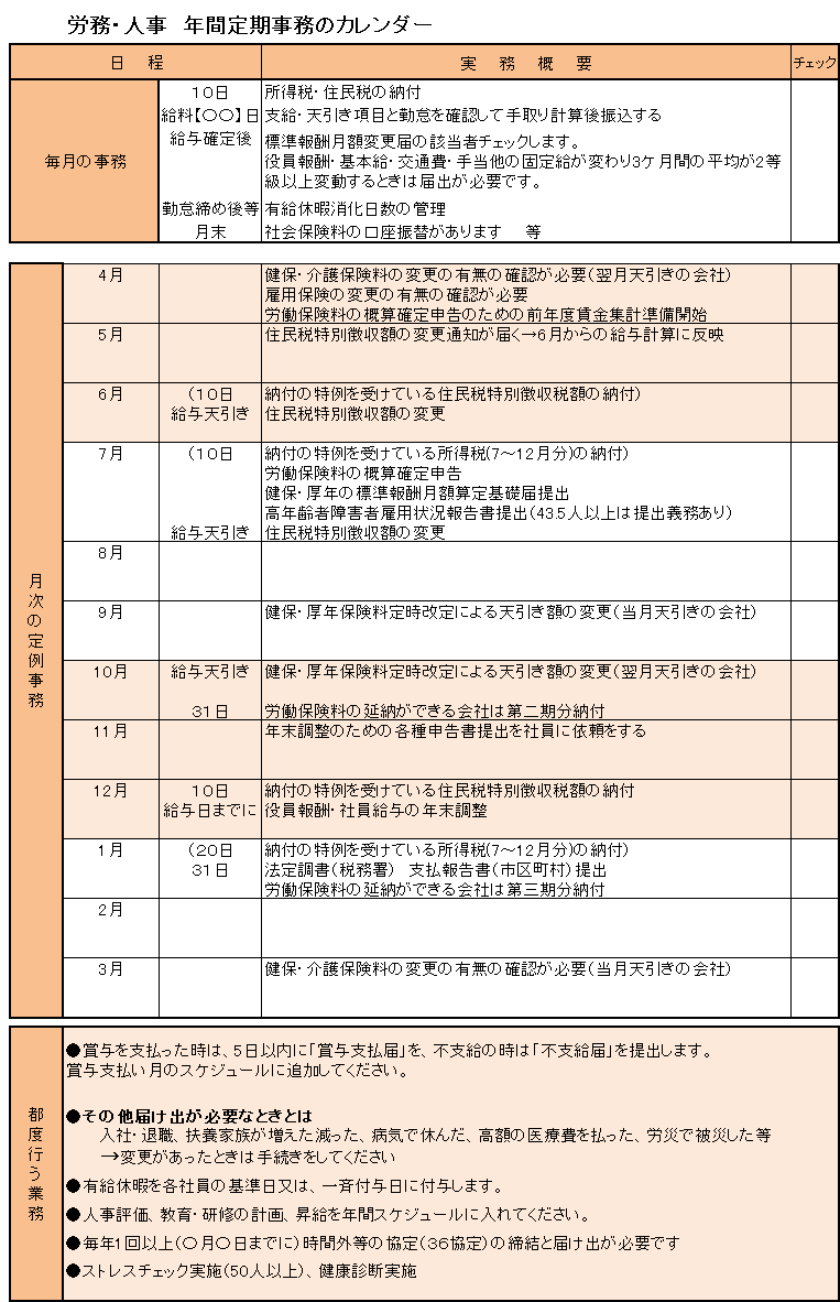 年度初めを迎えるにあたって、労務や人事に関連する業務を整理してみました。実務担当者がスケジュールを立てる際に参考になり、また、作業もれがないかチェック表として応用できると思います。一方で、経営者や管理者の方々においては、全体の業務の把握に役立てていただければと思います。