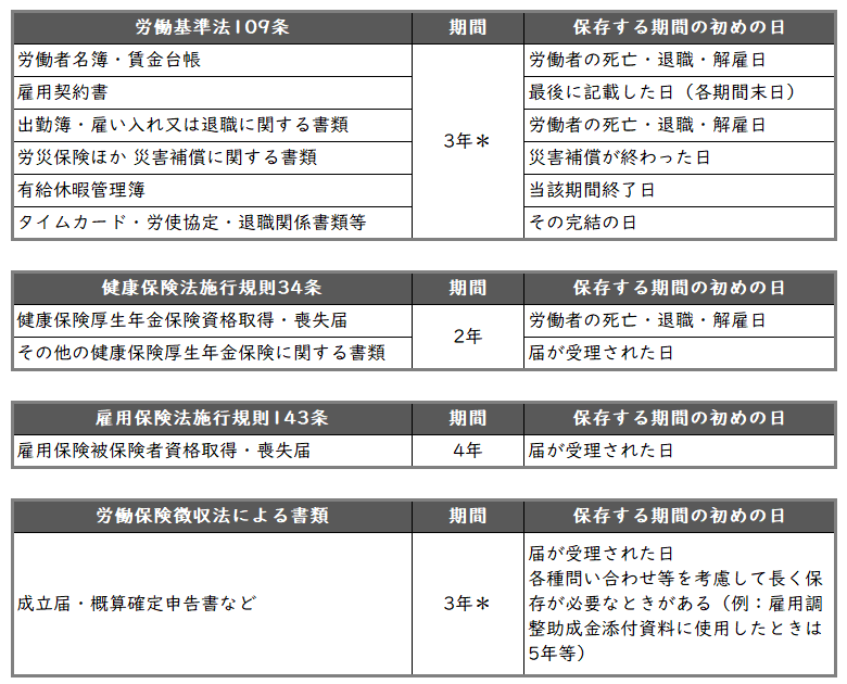 主な書類について保存期間をまとめると下表のとおりです。尚、民法改正と同時に賃金請求権の時効は5年に改正されています。ただし、当面は3年とされていますので、下表*印の書類については、当面のルールである3年と記載しました。今後、賃金請求権の時効が5年になったときは、保存期間も5年になりますので注意しなければなりません。