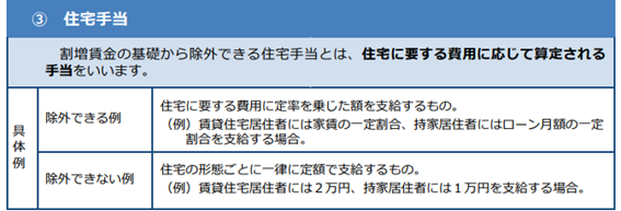 また、①~⑤の手当については、このような名称の手当であれば、すべて基礎となる賃金から除外できるものではありません。(~以下省略~。基礎額から除外できる住宅手当とは、次のような解説があります)
