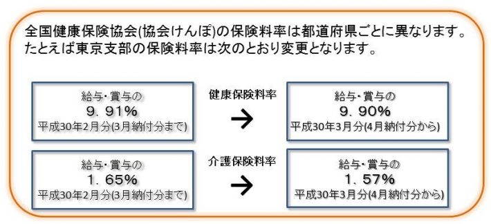 平成30年3月分(4月納付分)から保険料率がかわりますが、都道府県ごとに内容が異なります。今年の変更は、支部ごとに「引上げ」、「据え置き」、「引下げ」に分かれます。