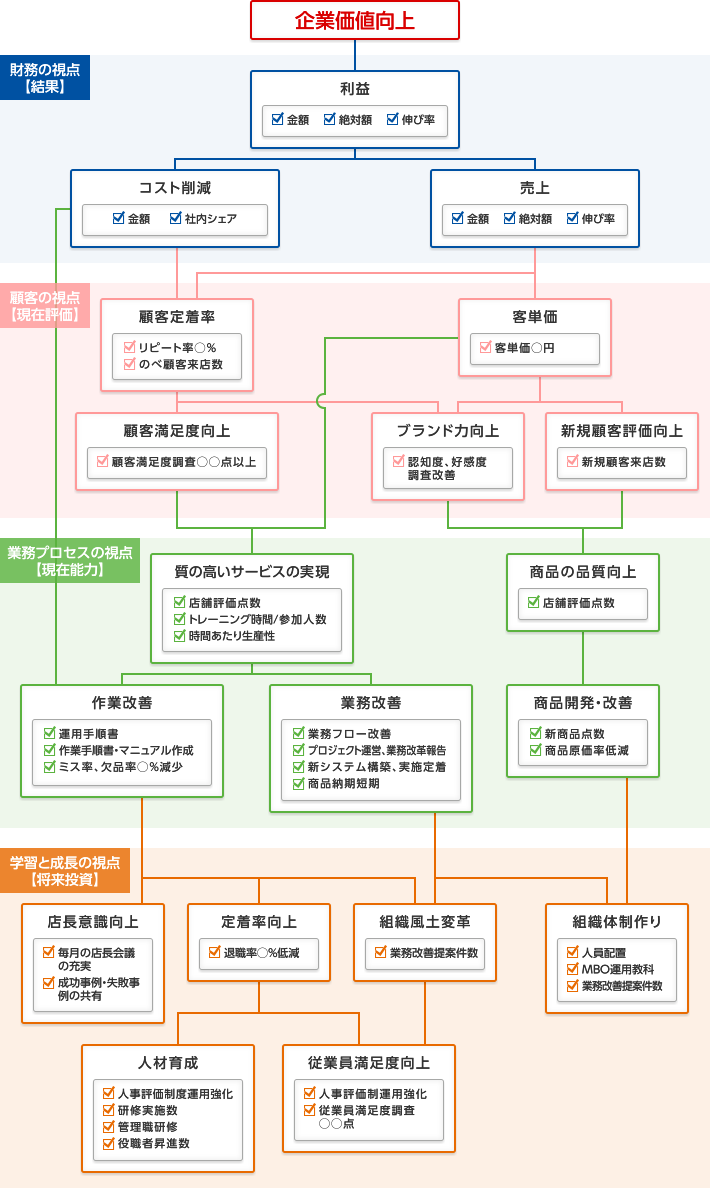 例として、「BSC(バランス・スコアカード)」を活用することによって、「人材育成」と「業務改善」、「顧客評価」「業績結果」が戦略的に結び付けられます。